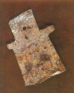 (2) قَطْعُ السَّطحِ الخلفيِّ لجزءٍ مِنَ الصَّدفةِ أوِ العظْمِ وثَقبُهُ وحَرقُهُ لتنتُجَ عــنْ ذلكَ تشقُّقاتُ العِرافةِ علَى سطحِها الأعلَى.