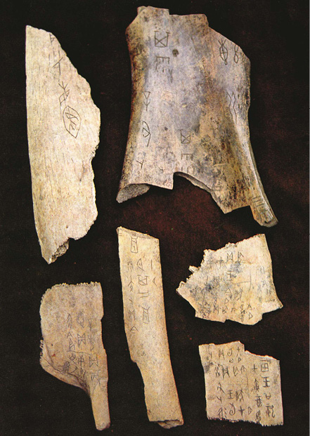 وُجِدَ نظامُ الكِتابةِ المُستخدَمُ فِي عهدِ «شَانْغ -Shang» منقوشاً علَى أصدافِ السَّلاحفِ، وعِظامِ الحيواناتِ (وتُعرفُ بـ«الكِتابةِ علَى عظمِ أُوراكلَ»)، وكذلكَ علَى الأوانِي البرونزيَّةِ (وتُعرفُ بـ«الـكتابةِ البرونزيةِ»)، وأحياناً علَى ألواحِ اليَشْمِ والفَخَّارِ. لكنَّ مُعظمَ الكِتاباتِ توجد علَى أصدافِ السَّلاحفِ والبُرونزِ.